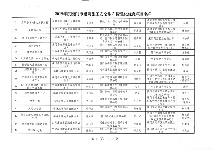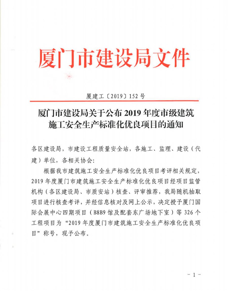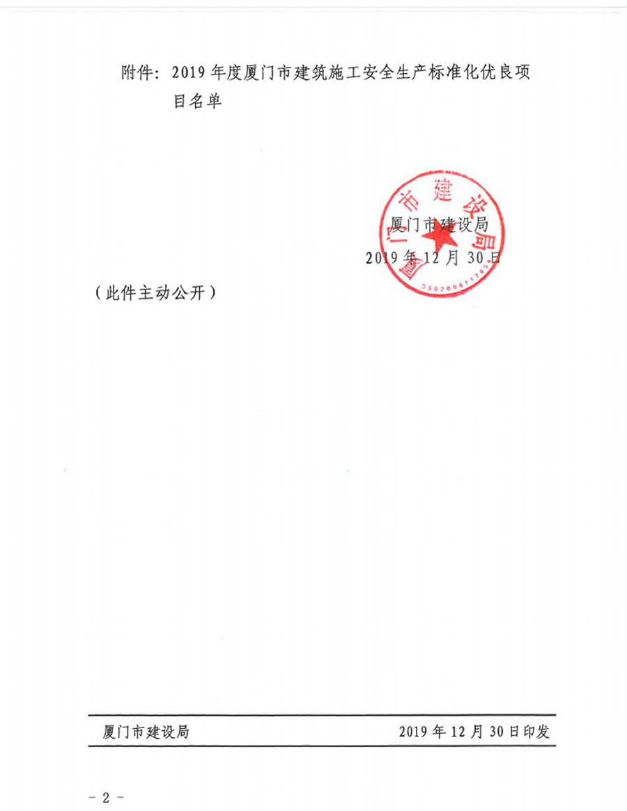 廈門市建設(shè)局關(guān)于公布2019年度市級建筑施工安全生產(chǎn)標(biāo)準(zhǔn)化優(yōu)良項目的通知